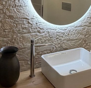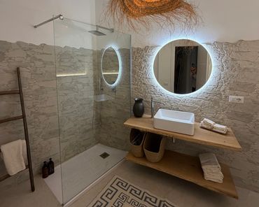 The interiors are elegant and harmonious, offering beautifully arranged spaces that invite relaxation after a day spent between the sea and the natural beauty of the surrounding landscape. Soft colour palettes, gentle lighting and carefully curated furnishings create an intimate and sophisticated setting, ideal for couples as well as families seeking tranquility and style.